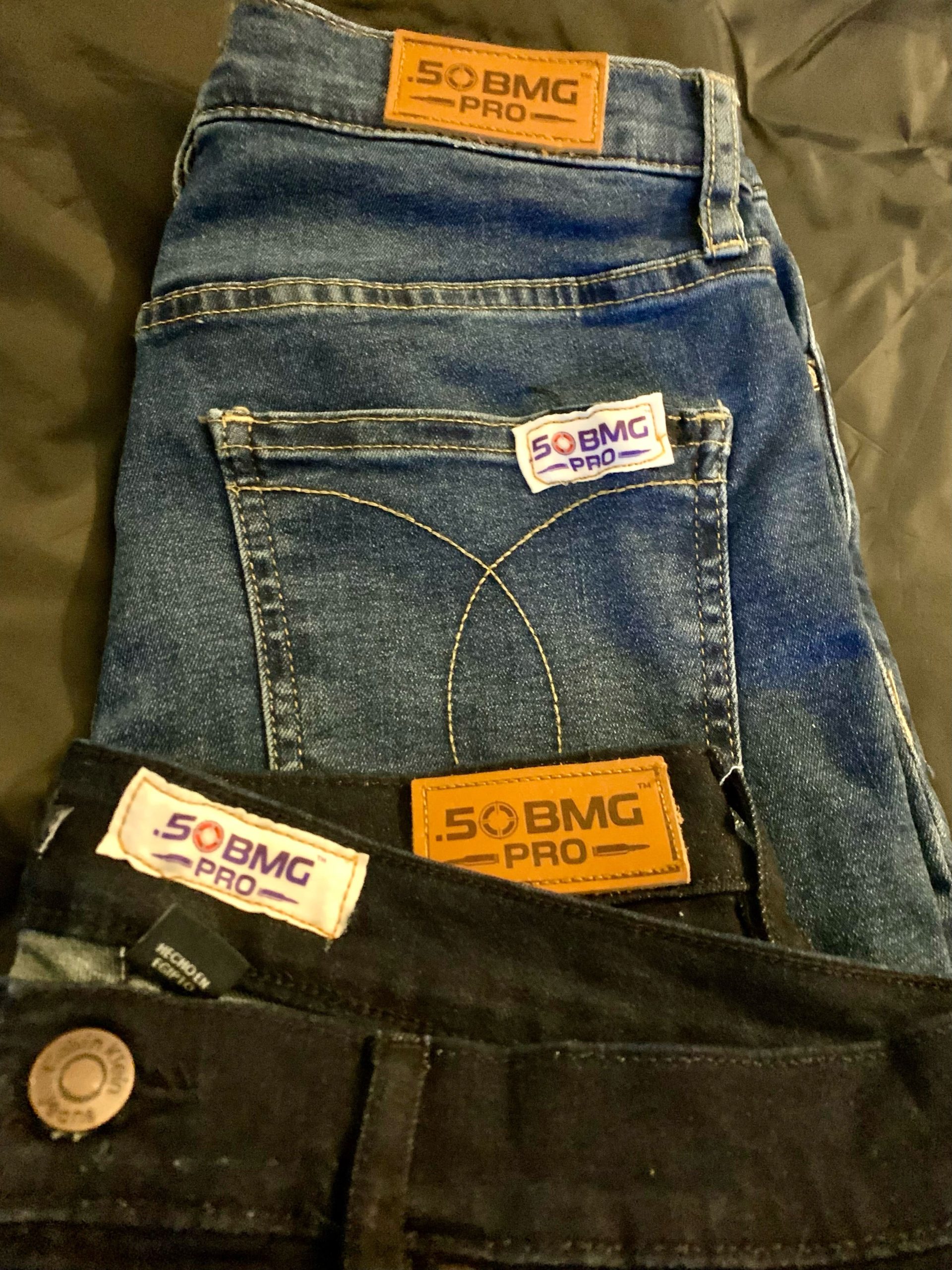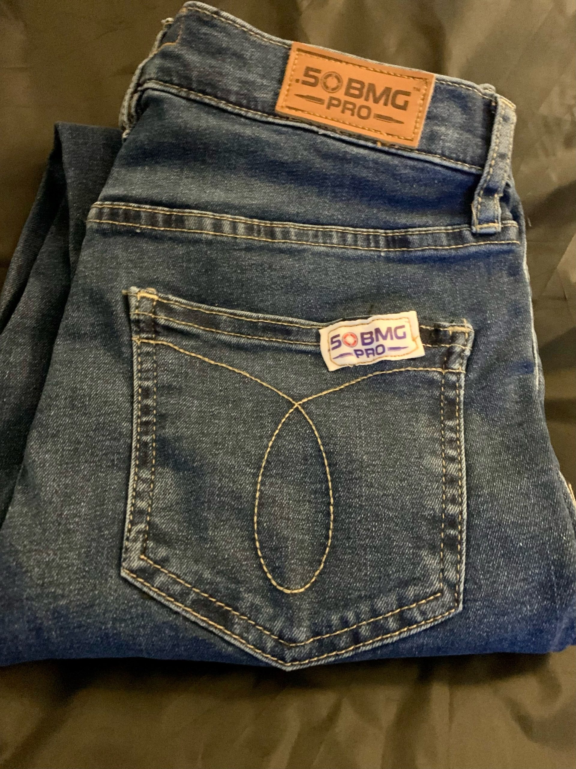 Sits just below the waist, straight leg opening, slim fit and boot cut. Limited production run of only 1000. Each pair is individually numbered and unique. One 50 BMG round through each leg! Sizes 0 thru 14